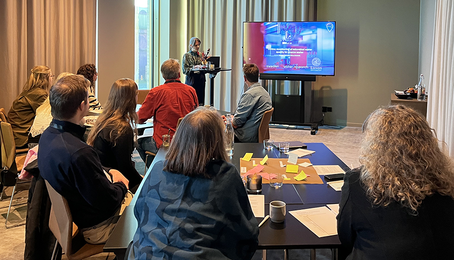 Människor sitter i en lokal och lyssnar på en kvinna som presenterar något på en skärm